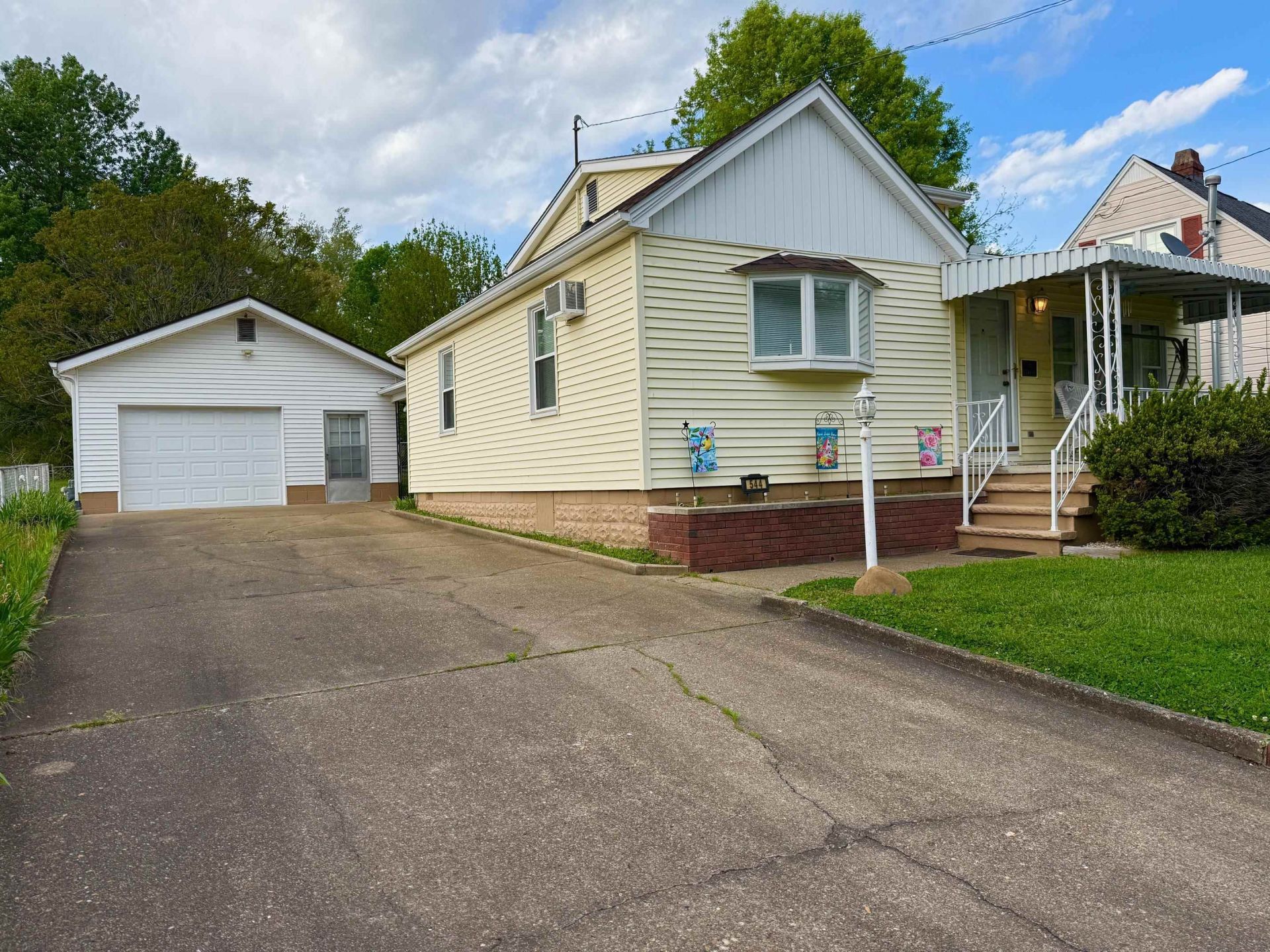 This Cute and spacious home is a rare find! It sets back from the road and has a nice driveway, detached garage with bathroom, fenced in back yard and cute front porch and side patio. Inside you will find 2044 square feet of space including the living room, eat-in kitchen, laundry area with full bath and a potential of 2 bedrooms with a connecting half bath! One bedroom could be used for a dining room, TV room, craft room or office. Upstairs are 2 additional bedrooms! Priced to sell at $139,900. to settle estate!